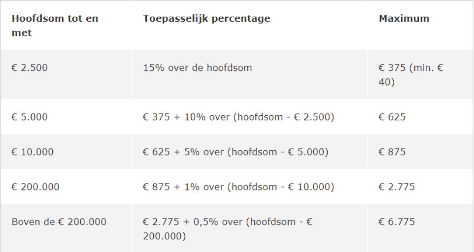 - Indien Klant in gebreke of in verzuim is en zijn verplichtingen niet tijdig nakomt, dan is Klant alle kosten verschuldigd die verband houden met de invordering van gefactureerde bedragen (buitengerechtelijke incassokosten daaronder begrepen). Indien de Klant in Nederland is gevestigd zijn de buitengerechtelijke incassokosten gelijk aan de normbedragen genoemd in de Wet normering buitengerechtelijke incassokosten en het bijbehorende Besluit vergoeding voor buitengerechtelijke incassokosten: